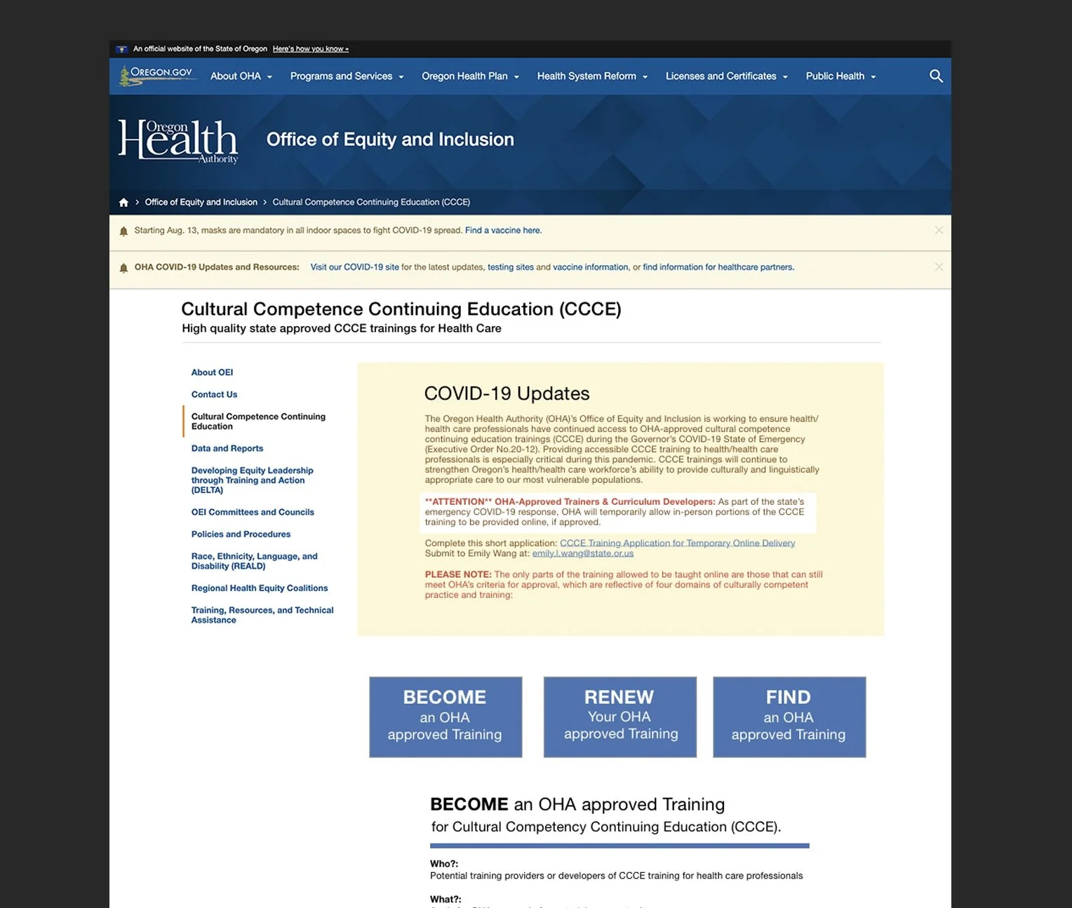 Oregon Health Authority, Cultural Competence Continuing Education Webpage